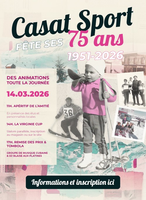 CASAT SPORT vous accueille dans ses 2 magasins dont un sur les pistes de Superbagnères au coeur de la station et l'autre à Luchon (en face de l’église et à coté de la maison de Peyragudes) à 500m du téléporté qui vous emmène en 10 mn à la station de Superbagnères.